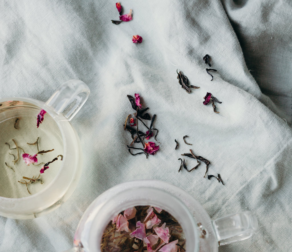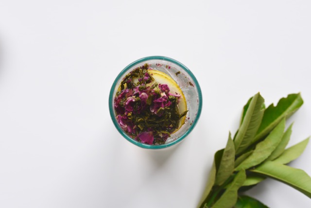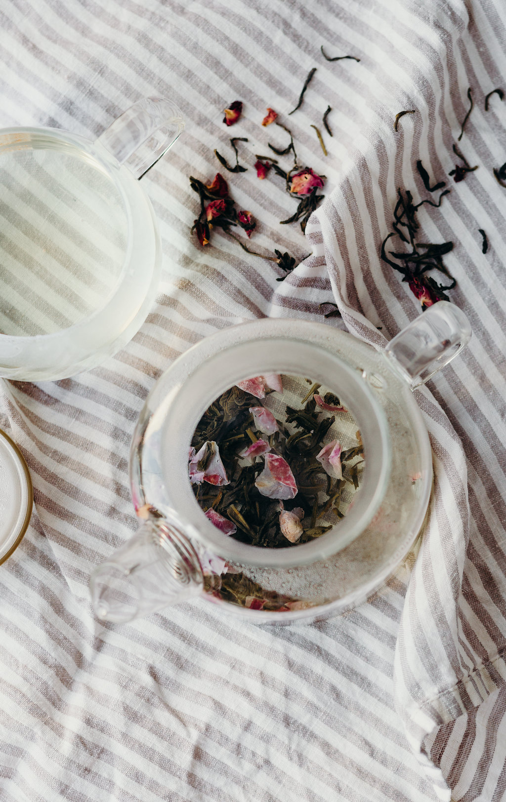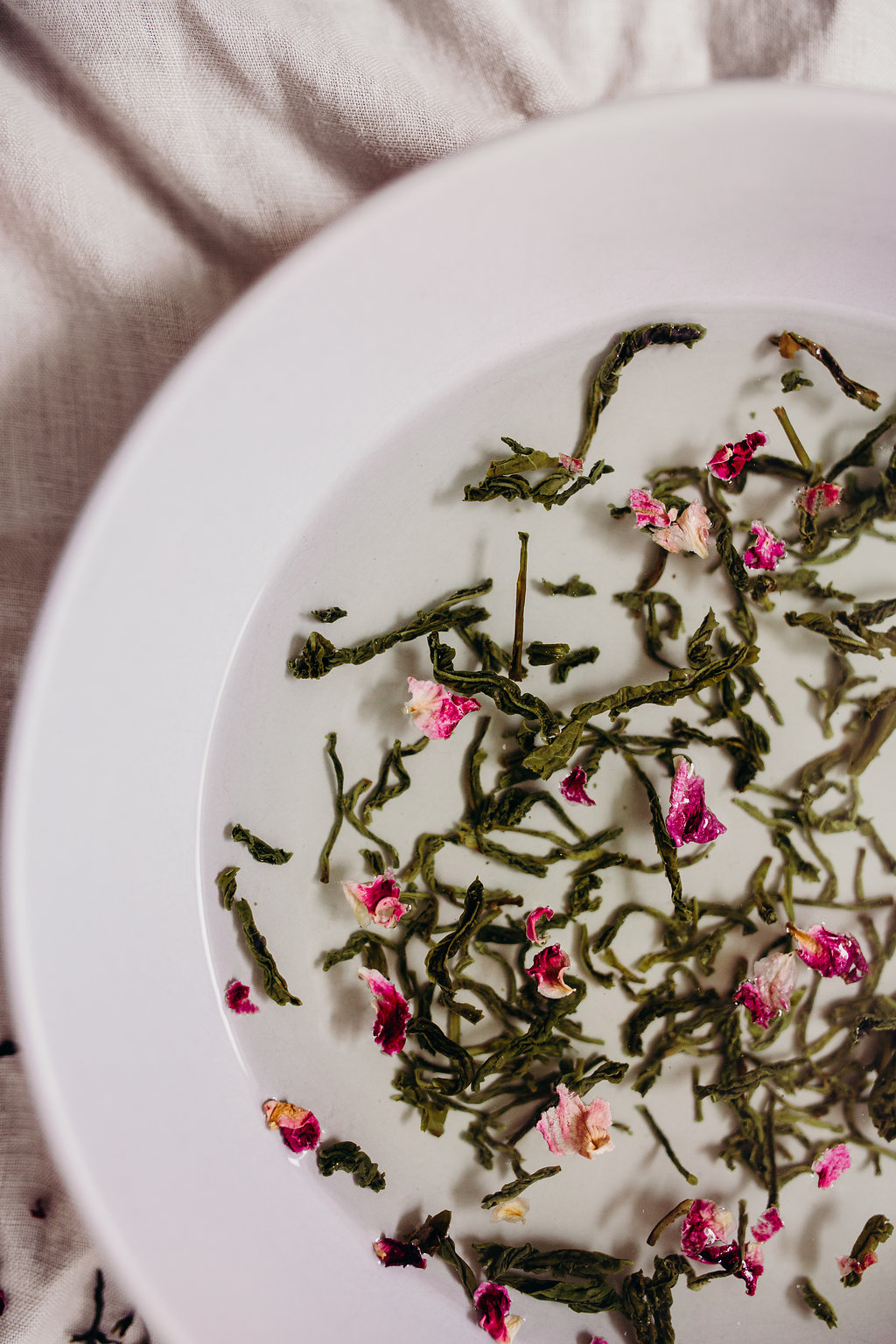 Pour the water into a large bowl and sprinkle in a handful of tea. We use our Rose Petal green tea and combine it with a little Cinnamon Chamomile