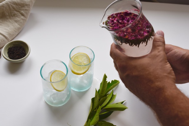 Fill glasses with ice and sliced lemon and pour over the cold infused tea filtering out the tea and rose petals with a strainer.